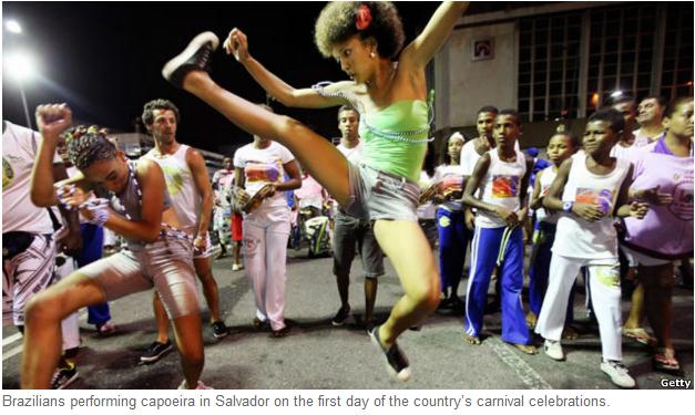 Capoeira is a Brazilian martial art form which combines elements of dance, music, acrobatics and fighting. It often forms a part of the Carnival of Brazil, an annual festival held forty six days before Easter. The lively celebrations attract millions of visitors each year.