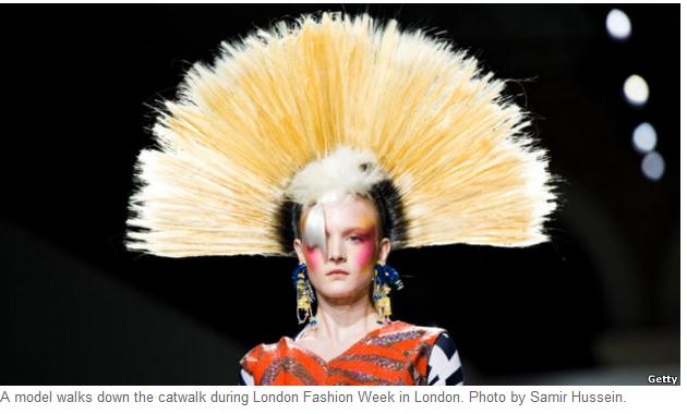 伦敦时装周很出名。通常在每年二月和九月举办。本图中的模特正在为 Louise Gray 品牌走秀,时装设计师 Louise Gray 说,她给予 2012年时装展的灵感是自由,技术,幻影和阳光灿烂的日子。