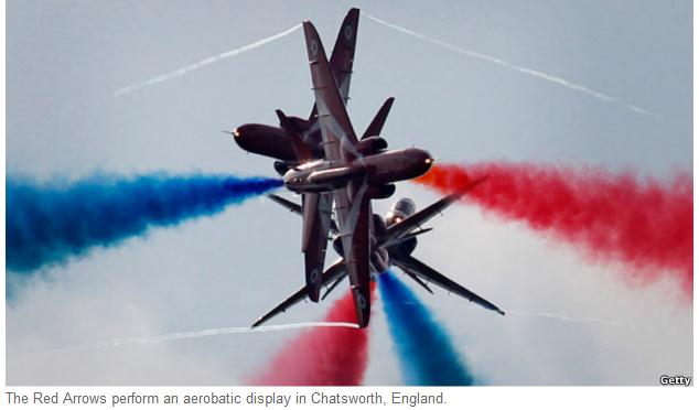 红箭是英国皇家空军的空中特技飞行表演队。飞机在空中飞过时会留下一缕缕有颜色的烟雾。这些烟雾是飞机从排气管释放柴油,然后通过氧化过程而形成的。在这张照片中,柴油里加入了红色和蓝色的染料,所以喷出的烟雾有了颜色。