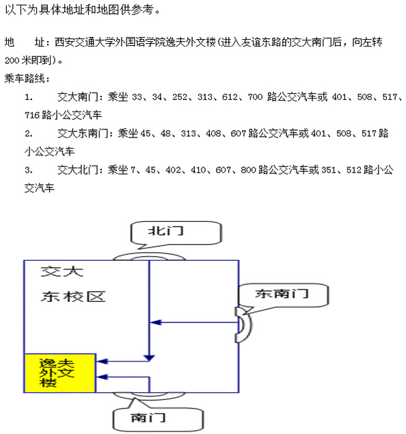 接英国使领馆文化教育处通知,报考2014年8月2日西安外国语大学雅思考试的所有考生的口语考试将安排在2014年7月31日(星期四)进行,口试场地变更为西安交通大学外国语学院逸夫外文楼(进入友谊东路的交大南门后,向左转200米即到)。