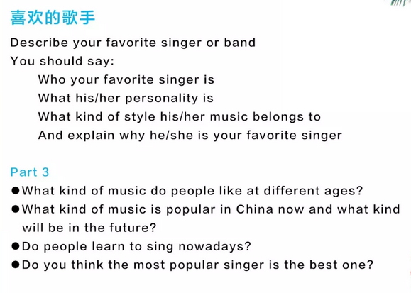 以下是新东方在线雅思网给大家整理的2019年5-8月雅思口语完整题库part2:喜欢的歌手,仅供大家参考,帮助大家更好的备考雅思口语考试,更多雅思口语题库内容,欢迎随时关注新东方在线雅思网。