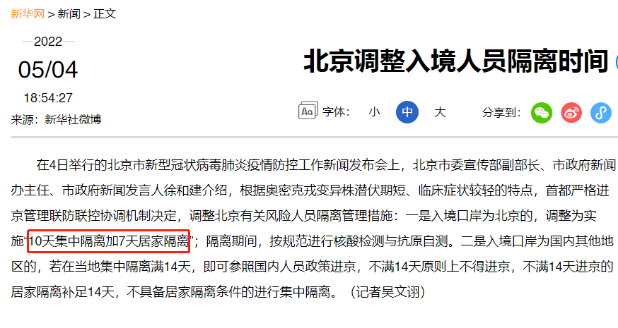 据新华社消息,入境口岸为北京的,调整为实施“10天集中隔离加7天居家隔离”;隔离期间,按规范进行核酸检测与抗原自测。