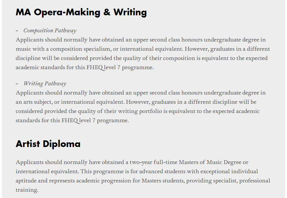所有对表演者的报价都是根据他们在试镜时的表现而定的。候选人需要本科学位或同等国际资格,通常是音乐专业。RCM 欢迎来自各种背景的申请人,并且可以考虑其他资格。雅思要求总分不低于5.5,各项不低于5.5。