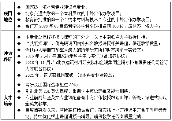 本项目是北京地区高校中第一个获教育部批准的 "纳米材料与技术" 专业的本科教育中外合作办学项目【教外综函[2012]49号】,是北京交通大学第一个本科层次的中外合作办学项目,是国内极少数获得国家一流专业建设点的中外合作办学项目。