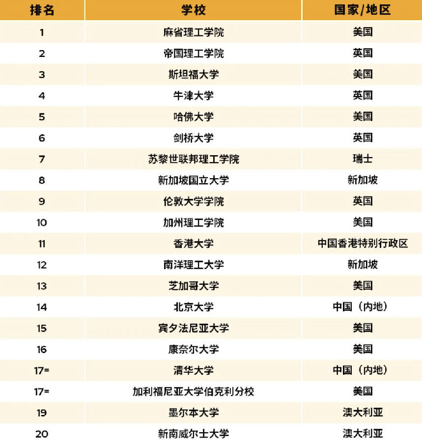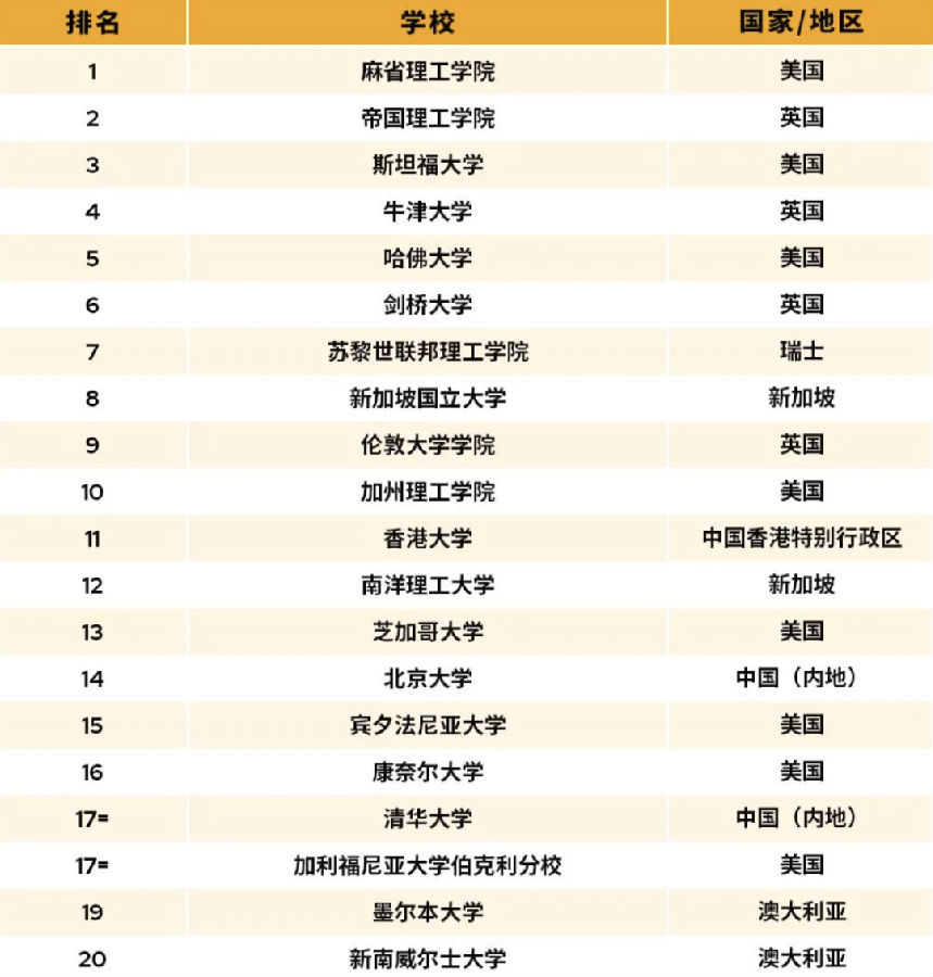 入围TOP10的院校分别是:麻省理工学院、帝国理工学院、斯坦福大学、牛津大学、哈佛大学、剑桥大学、苏黎世联邦理工学院、新加坡国立大学、伦敦大学学院、加州理工学院。