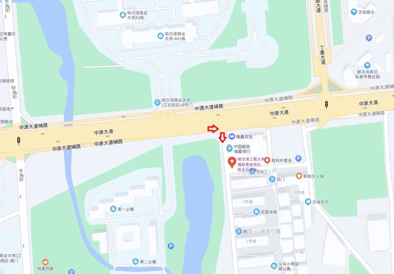 1. 考点位置:哈尔滨市松北区中源大道9100-5号,“哈尔滨工程大学国际考试中心松北分考场”(高德地图)。附近标志性地点有:哈尔滨商业大学北校区, 9100号 OYO隆鑫宾馆(中源大道店),9100-3中国邮政(商大邮电所),具体地点和正门图如下: