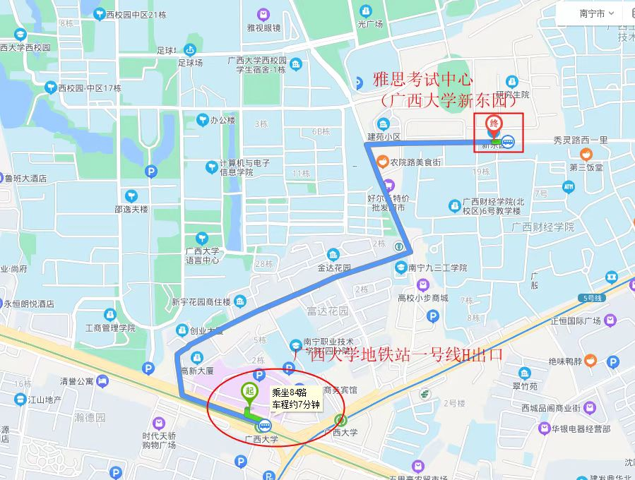 您的笔试/机考/口试雅思考点位于广西大学新东园门;考生须按规定从指定的校门进出,即考生只能从广西大学新东园门进出校园;地址:南宁市西乡塘区秀灵路西一里【腾讯地图导航:广西大学新东园(秀园校区);交通工具:可乘坐市内公交车84、218路在广西建设学院站下车,下车后即可看到校门;地铁1、5号线在广西大学站下车,下车后步行约20分钟可到达】。校门与考点即广西大学学生公寓东25栋之间距离20米左右。进校门后,您的右边楼栋三楼即为雅思考场。建议您比常规的到达时间提前30分钟或更早到达学校,确保有足够的时间完成相关检录工作。