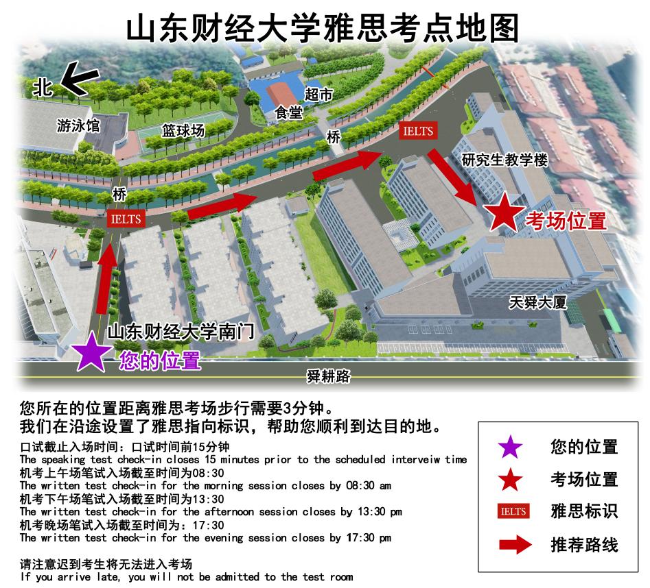 工作日早上考点门口西侧的舜耕路交通流量较大,请考生务必合理安排行程,按照上述要求的时间到达考点,以免耽误考试。