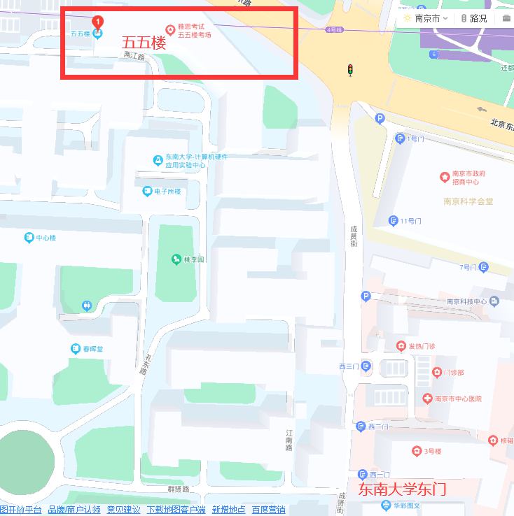 您的考试地点位于东南大学四牌楼校区五五楼3楼,考试日考生进入校区的唯一通道为学校东门(成贤街市级机关医院对面),所有考生(包括18岁以下考生)家长、陪考人员一律禁止入校。出租车、网约车和私家车等社会车辆禁止入校。雅思考场入口处从五五楼中间楼梯上三楼。