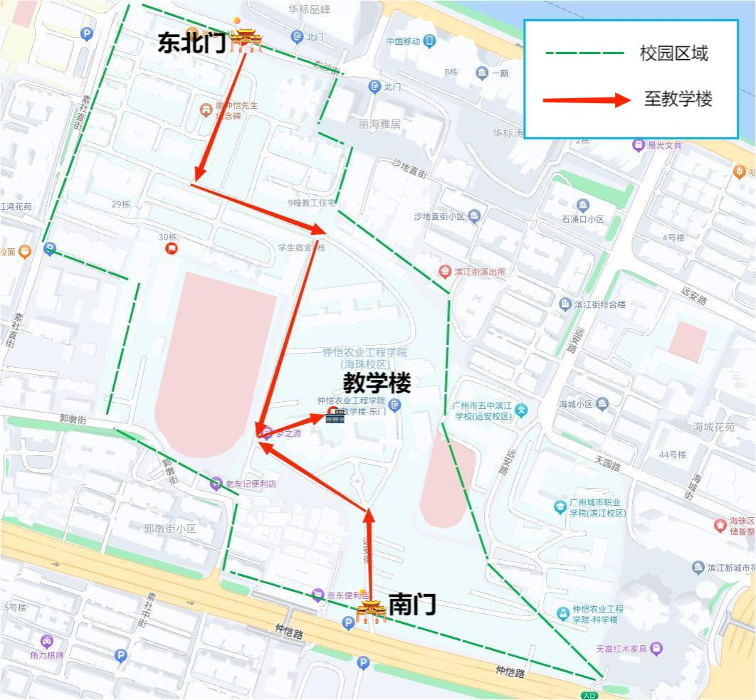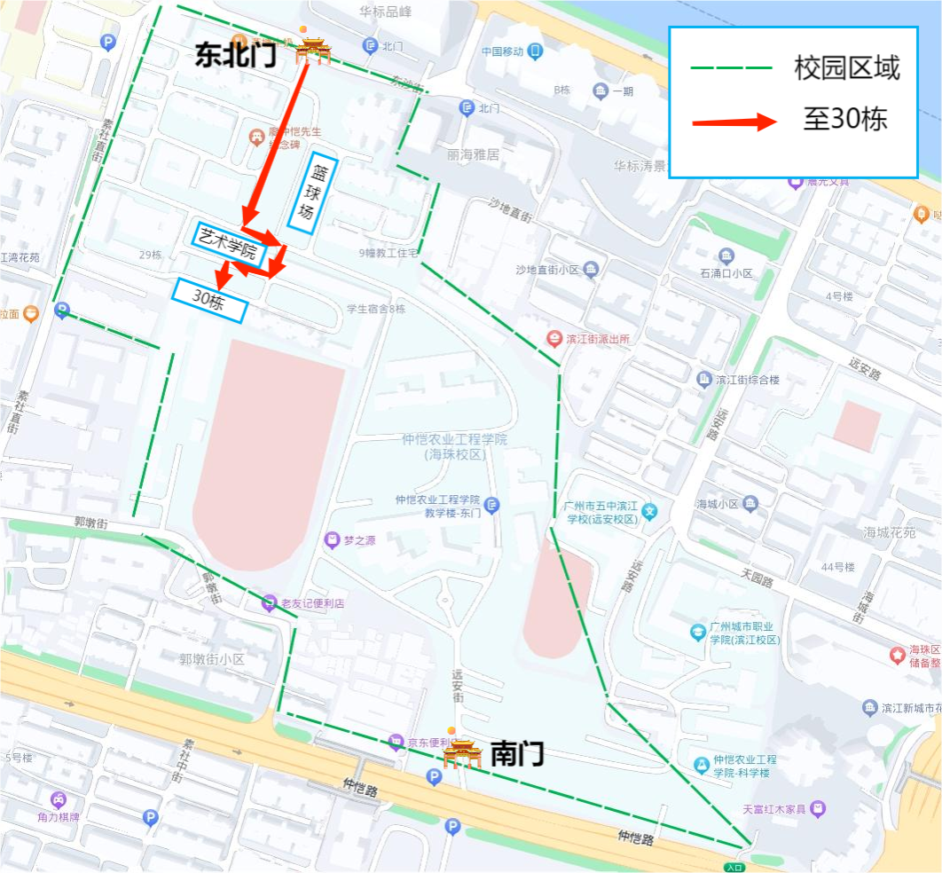(一)您的雅思考试考场【纸笔(笔试部分)】位于广州市海珠区仲恺路501号仲恺农业工程学院教学楼。【机考/纸笔(口试部分)】位于广州市海珠区东沙街24号仲恺农业工程学院30栋大楼。考生可从位于【海珠区东沙街24号的东北门】或【海珠区仲恺路501号的学校南门】步行进入校园。