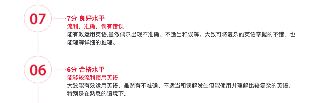 而7分标准则如上图:流利,准确,偶有错误,意味着该分数的同学能够有效的运用英语,偶尔出现不准确,对复杂的英语掌握的较好。