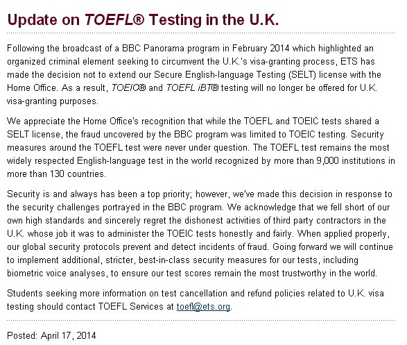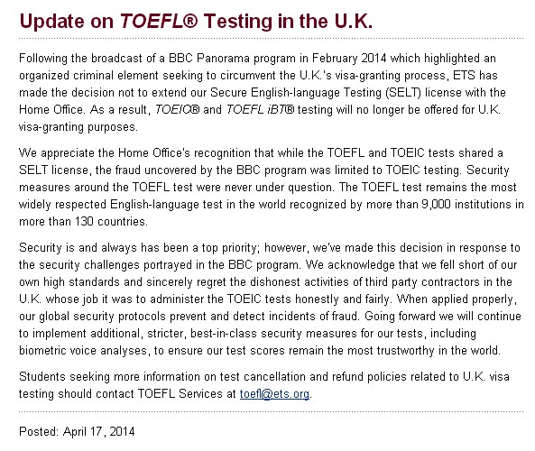 4月17日,英国内政部官网发布消息称,与ETS(美国教育考试服务中心)之间的考点授权合同至2014年4月5日终止。英国移民局明确表示不再承认托福及托业成绩。 4月22日晚,英国高等教育与...
