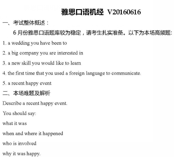 为了方便大家的学习,新东方在线雅思网第一时间为大家准备了有关2016年6月16日雅思口语真题(网友回忆版)的内容,供大家阅读参考!新东方在线雅思网将第一时间为大家发布最新、最全、最专...