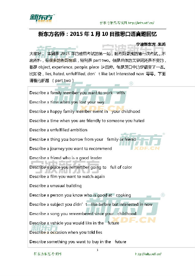 来源 : 网络 03月27日 10:37 关键字 : 2015年1月10日雅思口语机经(新东方回忆版)