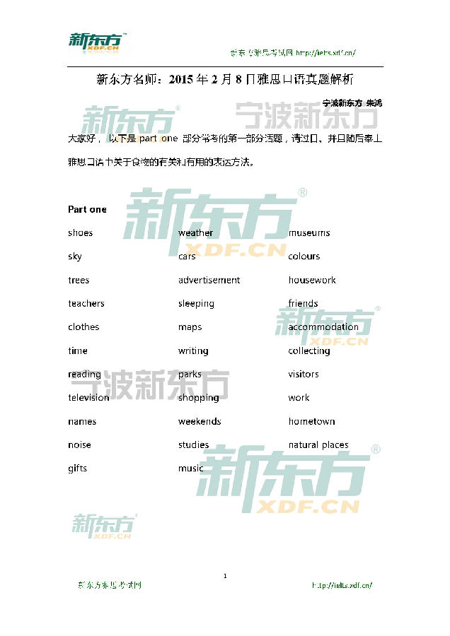 为了方便大家的学习,新东方在线雅思频道第一时间为大家准备了有关2015年2月7日雅思口语机经(新东方回忆版)的内容,供大家阅读参考! Part 1 1. Shopping, Do you prefer sma...