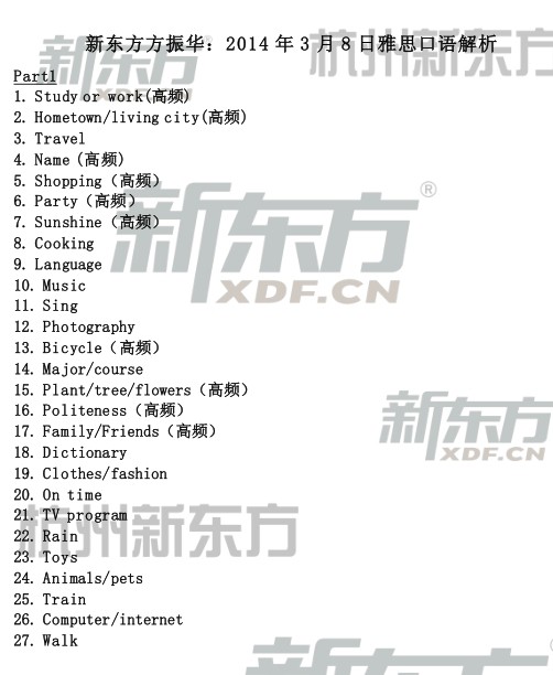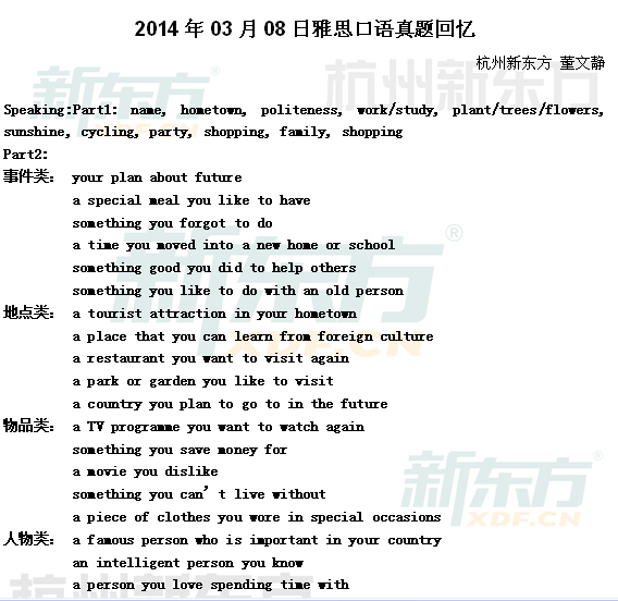 来源 : 杭州新东方 03月10日 11:03 关键字 : 2014年3月8日雅思口语机经