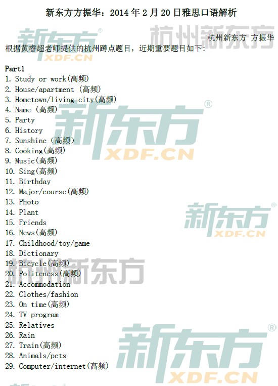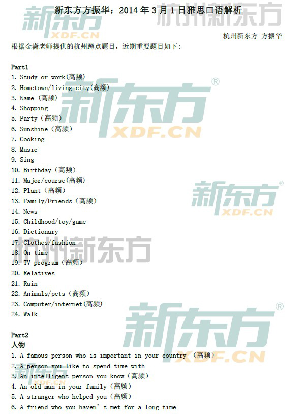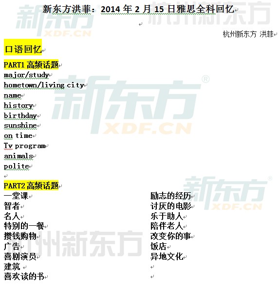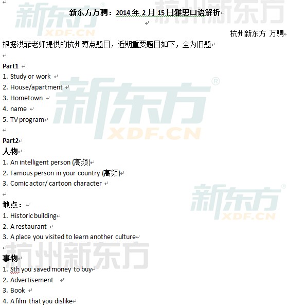 来源 : 杭州新东方 02月17日 13:54 关键字 : 2014年2月15日雅思口语真题解析