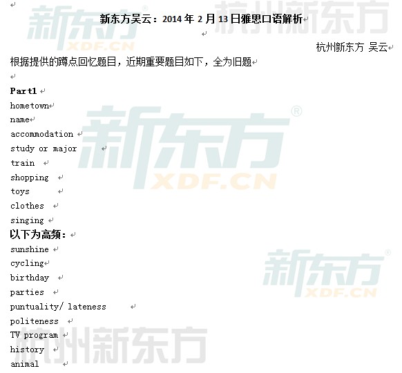 来源 : 杭州新东方 02月24日 14:26 关键字 : 2014年2月13日雅思口语机经解析