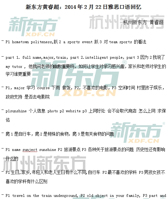 来源 : 杭州新东方 02月25日 11:50 关键字 : 2014年2月22日雅思口语机经回忆