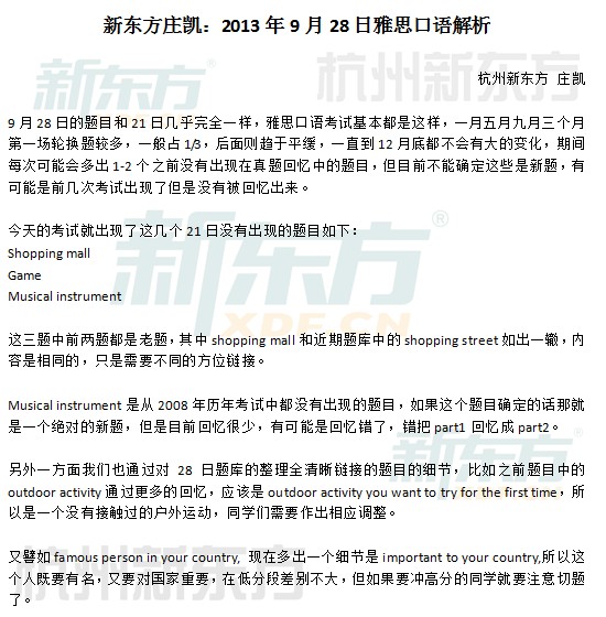 以下就是新东方在线雅思频道第一时间为大家整理收集的新东方庄凯老师的2013年9月28日雅思口语解析,希望对各位考生雅思备考有所帮助! 以上就是新东方在线雅思频道为大家整理的:2013...