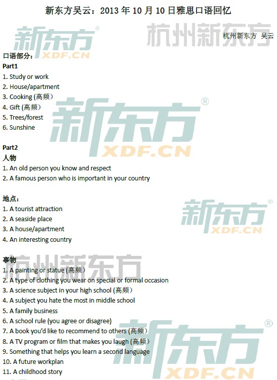 以下就是新东方在线雅思频道第一时间为大家整理收集的新东方吴云老师的2013年10月10日雅思口语真题回忆,希望对各位考生雅思备考有所帮助!