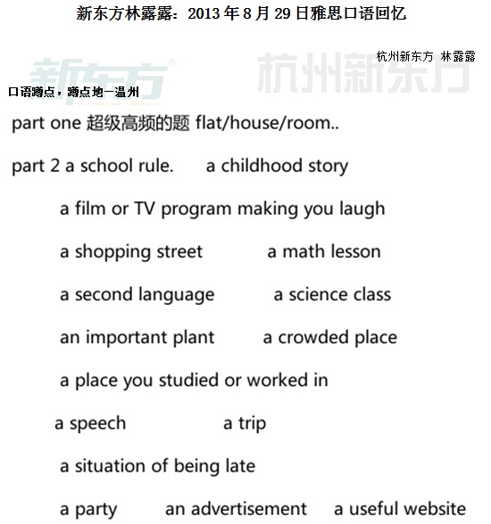 以下就是新东方在线雅思频道第一时间为大家整理收集的新东方林露露老师的2013年8月29日雅思口语考题回忆,希望对各位考生雅思备考有所帮助!