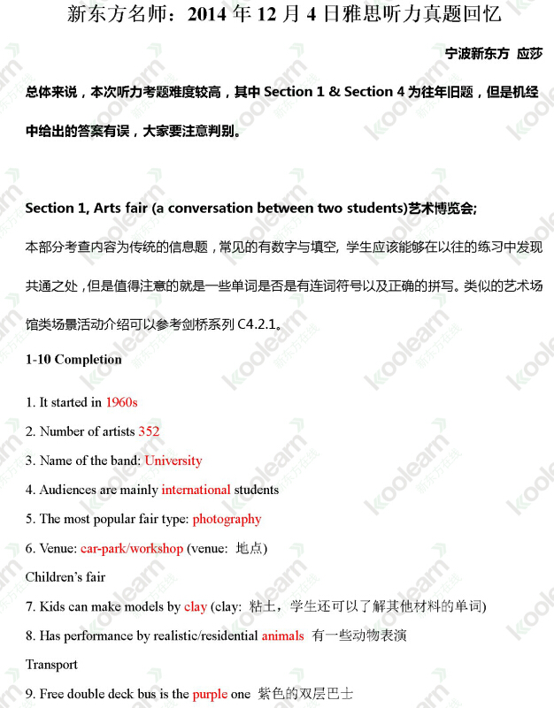 来源 : 网络 12月16日 10:20 关键字 : 2014年12月4日雅思听力真题回忆