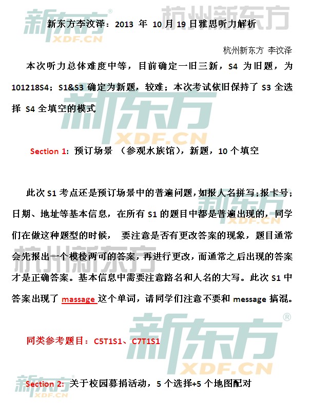 下面是新东方在线雅思频道第一时间为大家整理收集的新东方李汶泽老师的2013年10月19日雅思听力机经解析,更多最新、最专业的雅思备考资料,资讯,尽在新东方在线雅思频道![page][page][page]