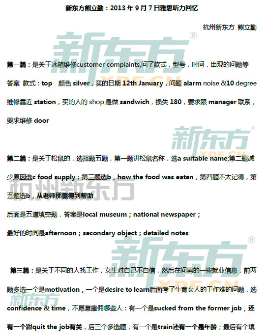 以下就是新东方在线雅思频道第一时间为大家整理收集的2013年9月7日雅思听力回忆(网友版),希望对各位考生雅思备考有所帮助! section1:冰箱坏了,top, 1.12,Sandwich, manager, do...