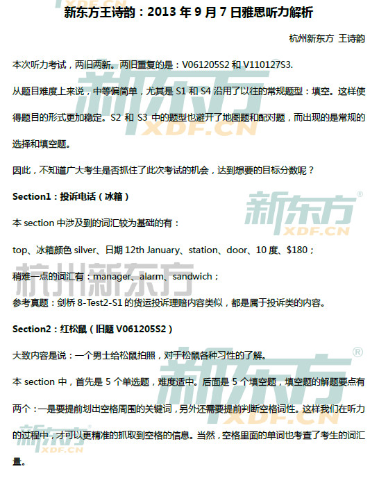 以下就是新东方在线雅思频道第一时间为大家整理收集的新东方王诗韵老师的2013年9月7日雅思听力解析,希望对各位考生雅思备考有所帮助! 本次听力考试,两旧两新。两旧重复的是:V06120...