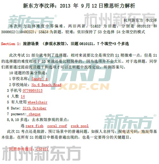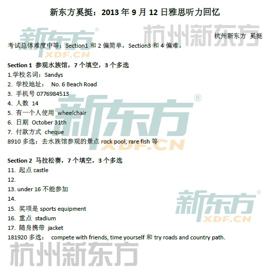 以下就是新东方在线雅思频道第一时间为大家整理收集的2013年9月12日雅思听力机经(网友版),希望对各位考生雅思备考有所帮助! 回忆1 S1海洋博物馆咨询Sandys 学院6 Beach Road提...
