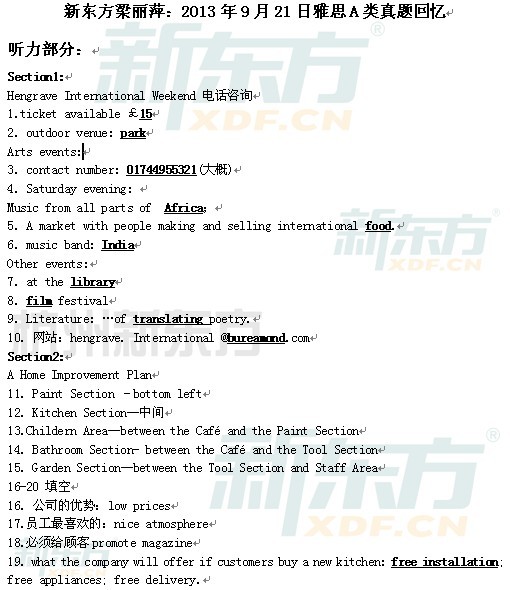 以下就是新东方在线雅思频道第一时间为大家整理收集的2013年9月21日雅思听力机经(网友版),希望对各位考生雅思备考有所帮助! s1 international weekend 填空 s2 home improve...