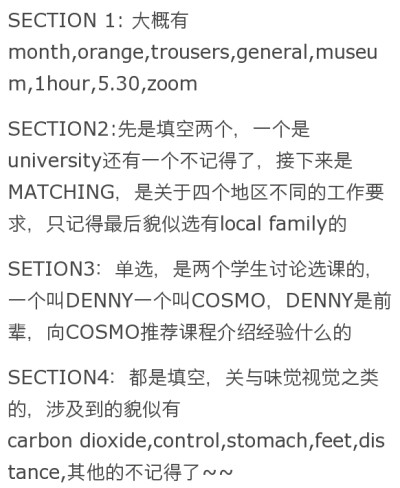 回忆1 section 3是关于两个人的选课问题,即一个叫penny的女的向另一个男的cosmo结束3-year biotech courses; section 4是关于一个lecture,讲的各种动物的在smell, hearing ...