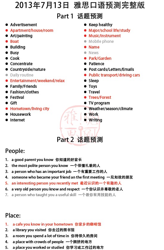 来源 : 新东方 07月22日 13:14 关键字 : 2013年7月雅思口语预测